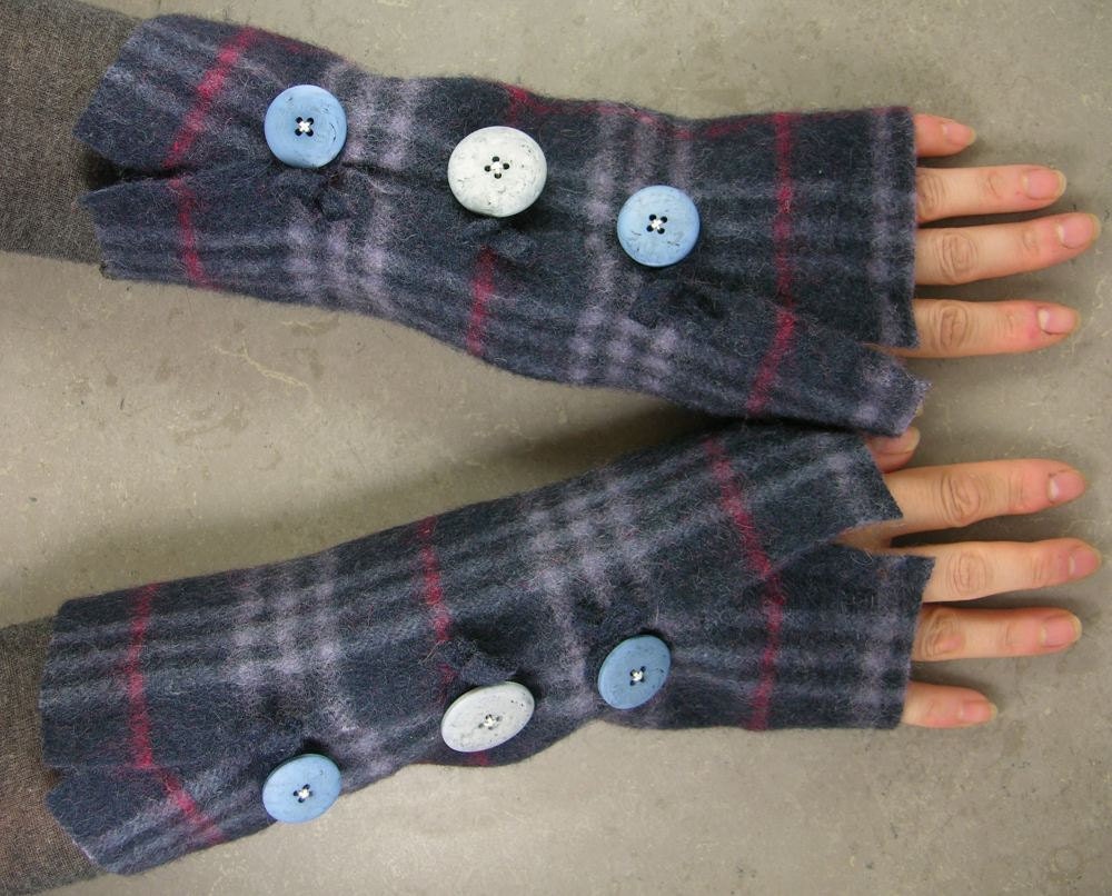 arm warmers fingerless mittens fingerless gloves arm cuffs recycled wool plaid blue grey red eco friendly unisex tbteam