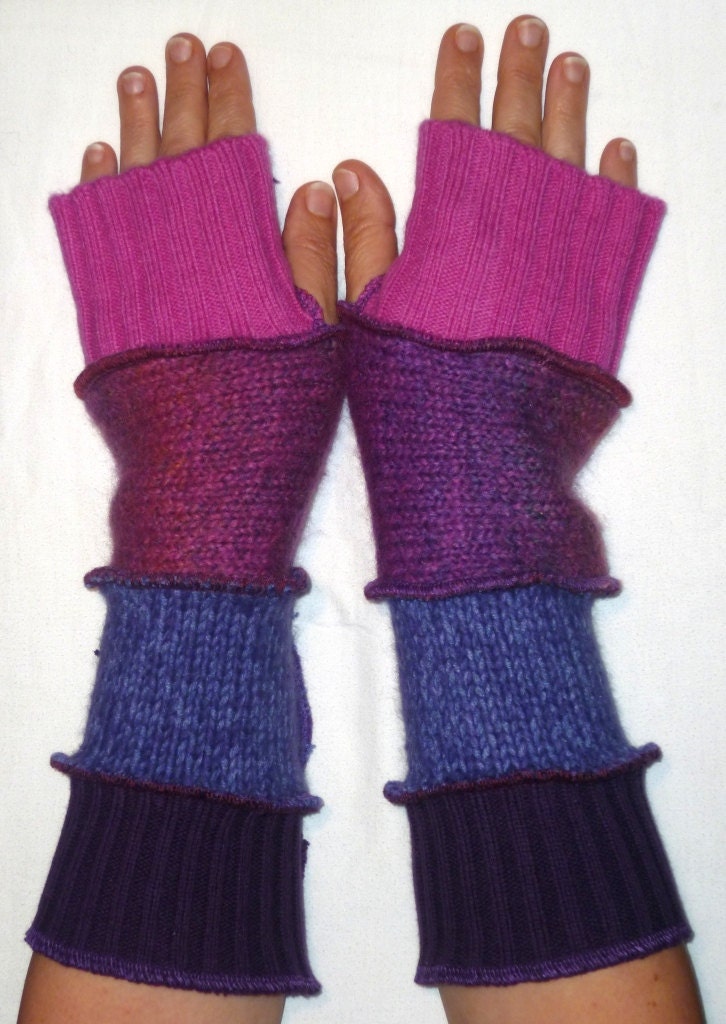 One of a kind arm warmers fingerless gloves from recycled sweaters purple & pink by SpiralGypsy